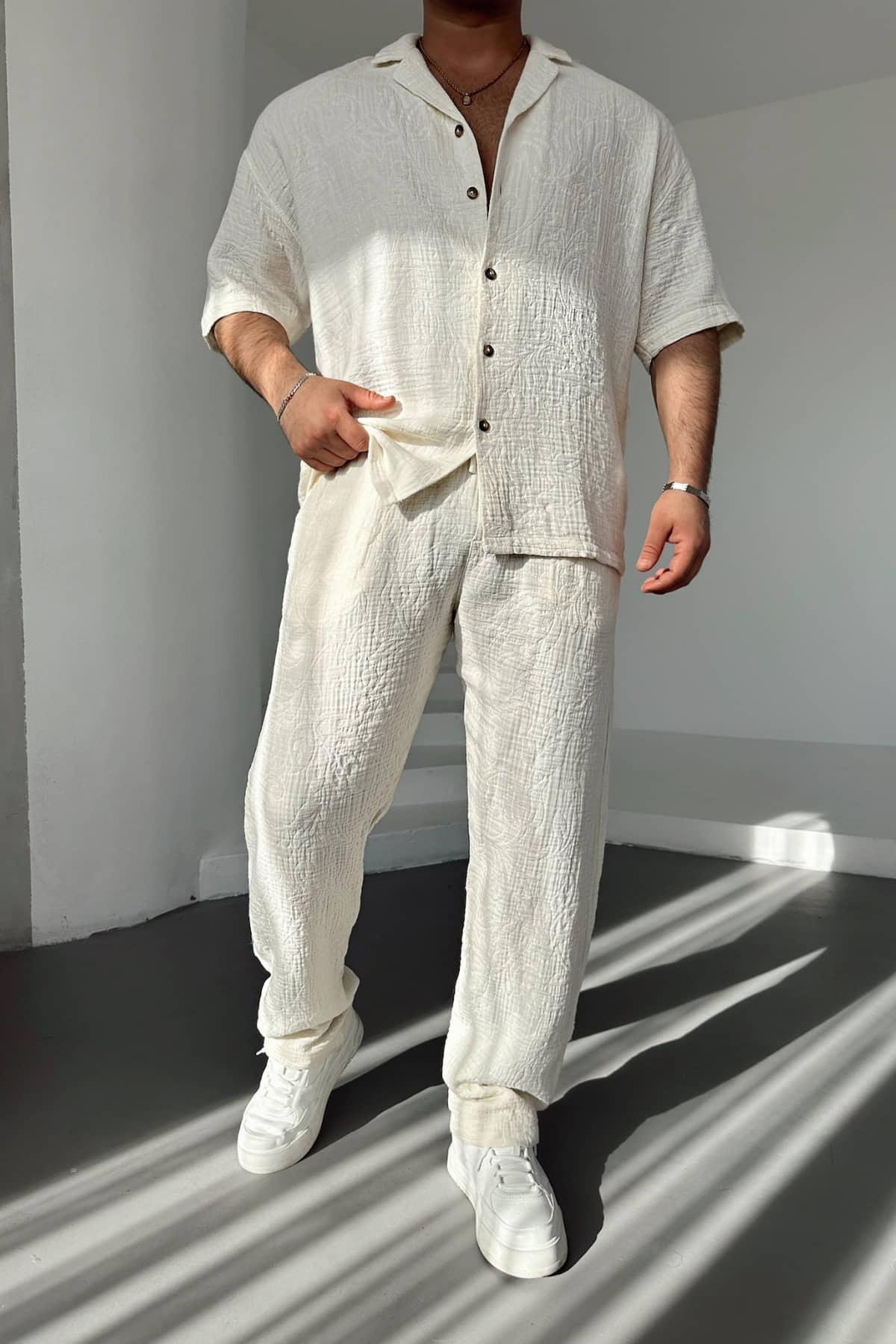 Beyaz Desenli Müslin Kumaş Takım