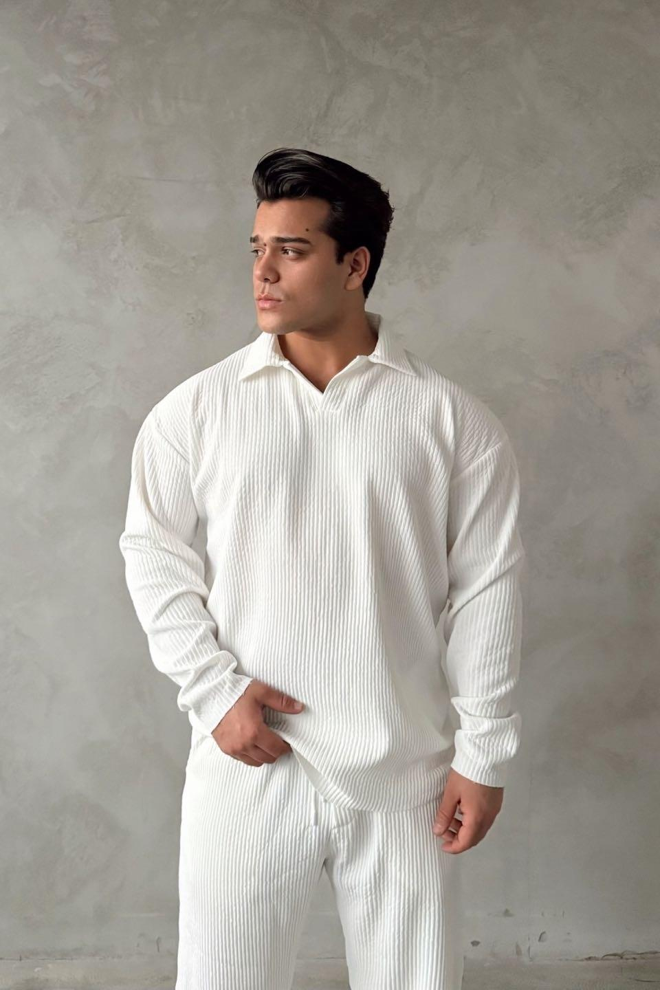 Beyaz Ottoman Kumaş Fitilli Polo Yaka Triko
