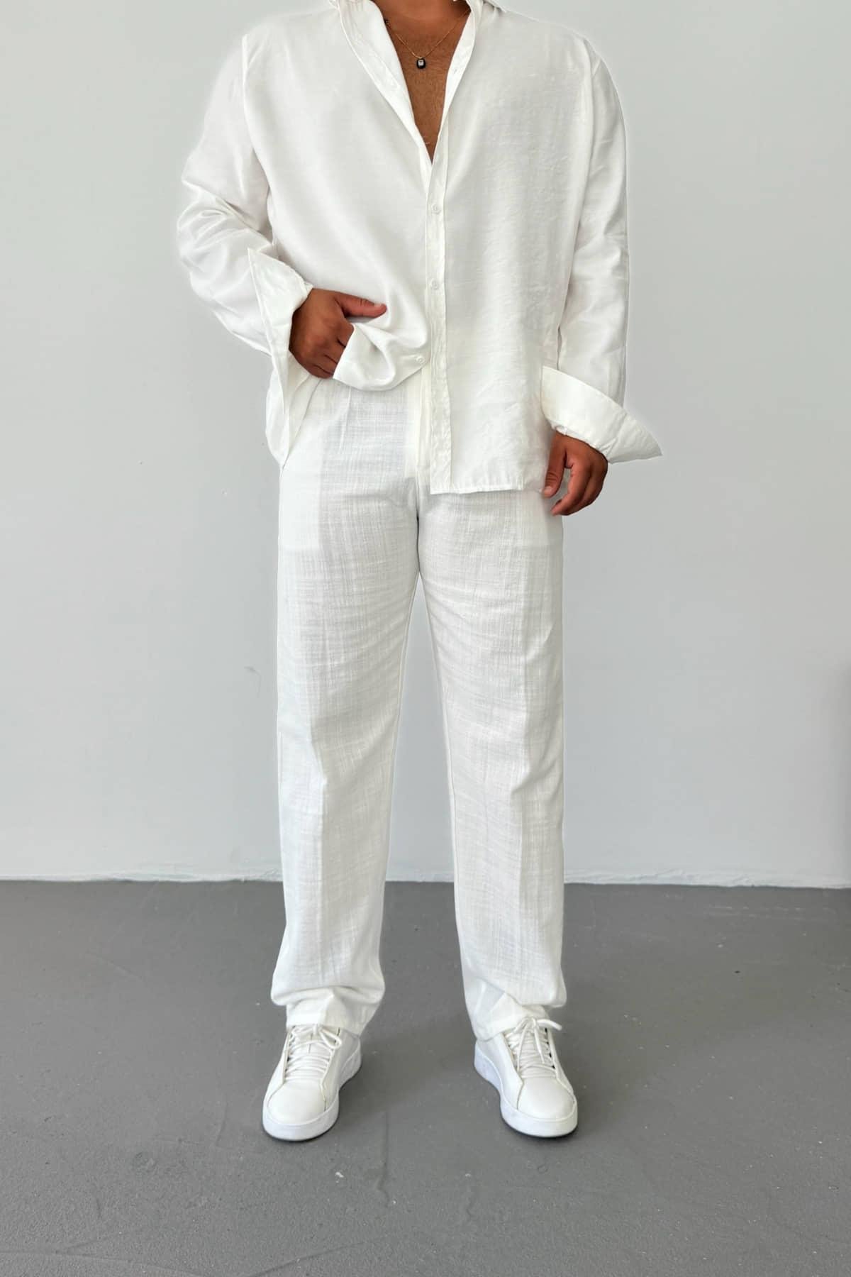 Beyaz Pileli Keten Baggy Pantolon