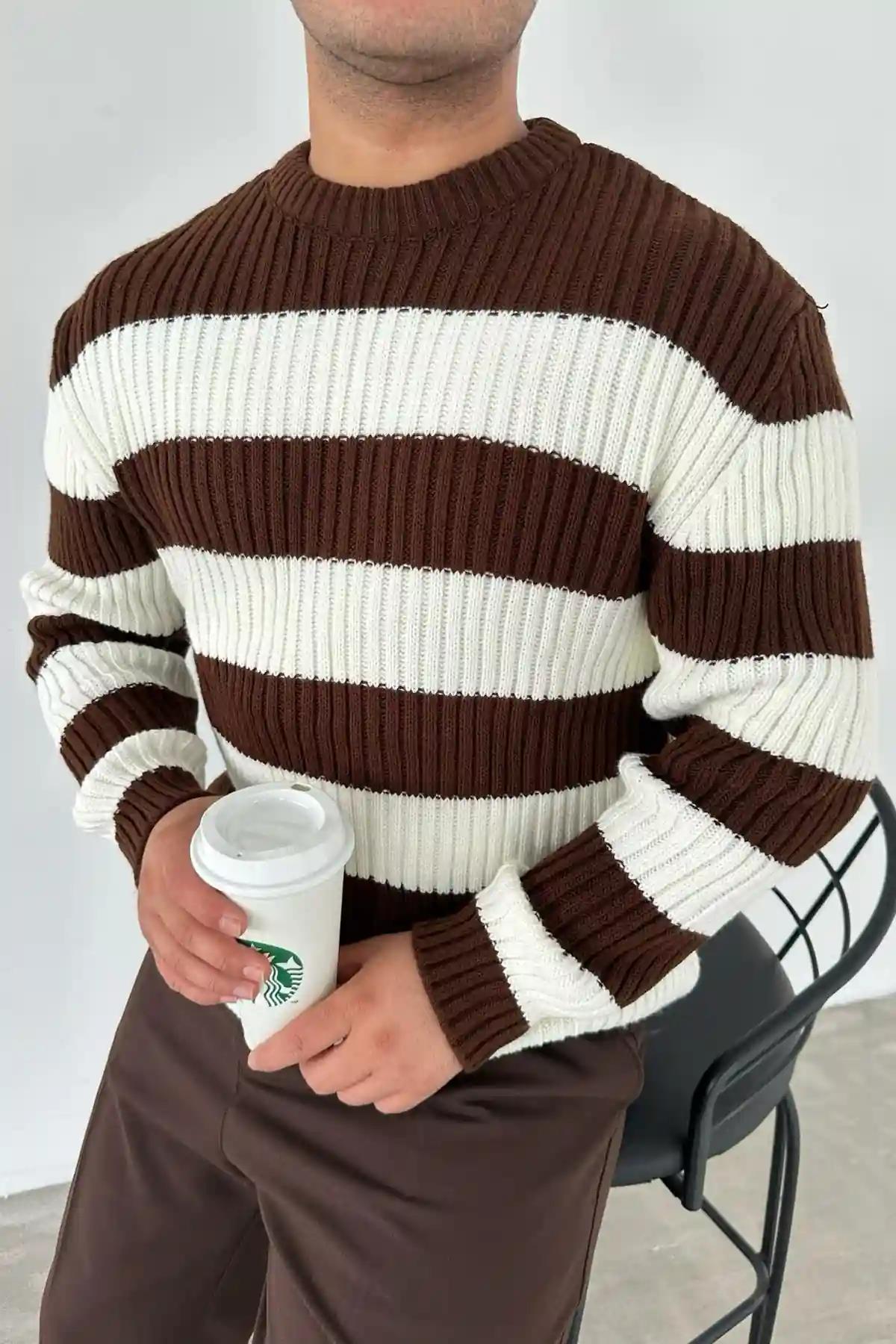 Çift Renkli, Bisiklet Yaka Acı Kahve-Beyaz Kazak