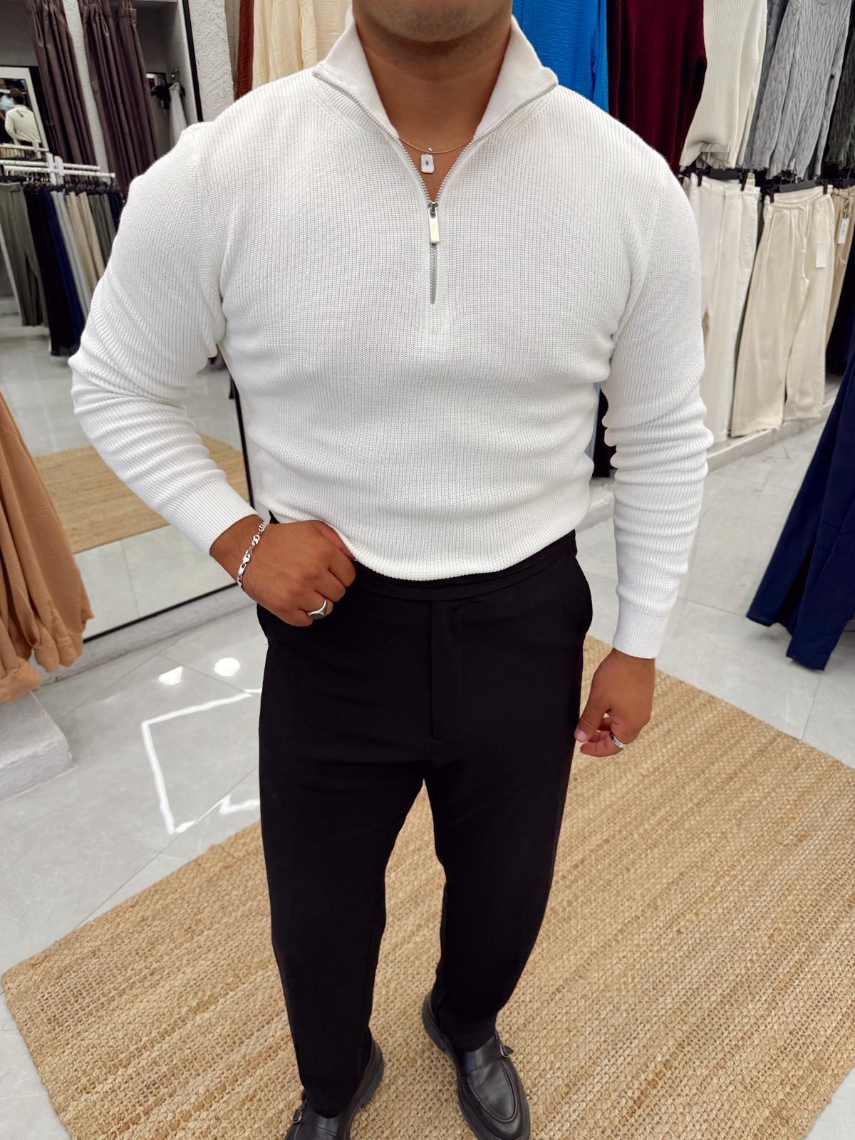 Dik Yaka Fermuarlı Kazak Beyaz