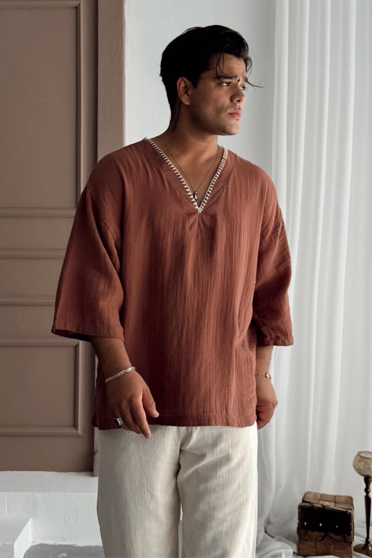 Kahve Müslin Kumaş V Yaka Fakir Kol