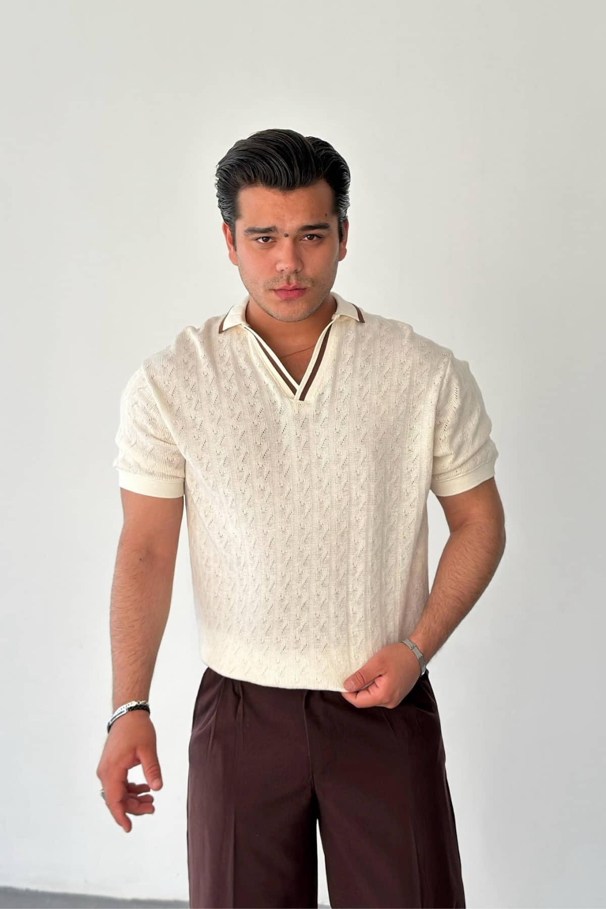 Kahve Şeritli V Yaka Desenli Triko