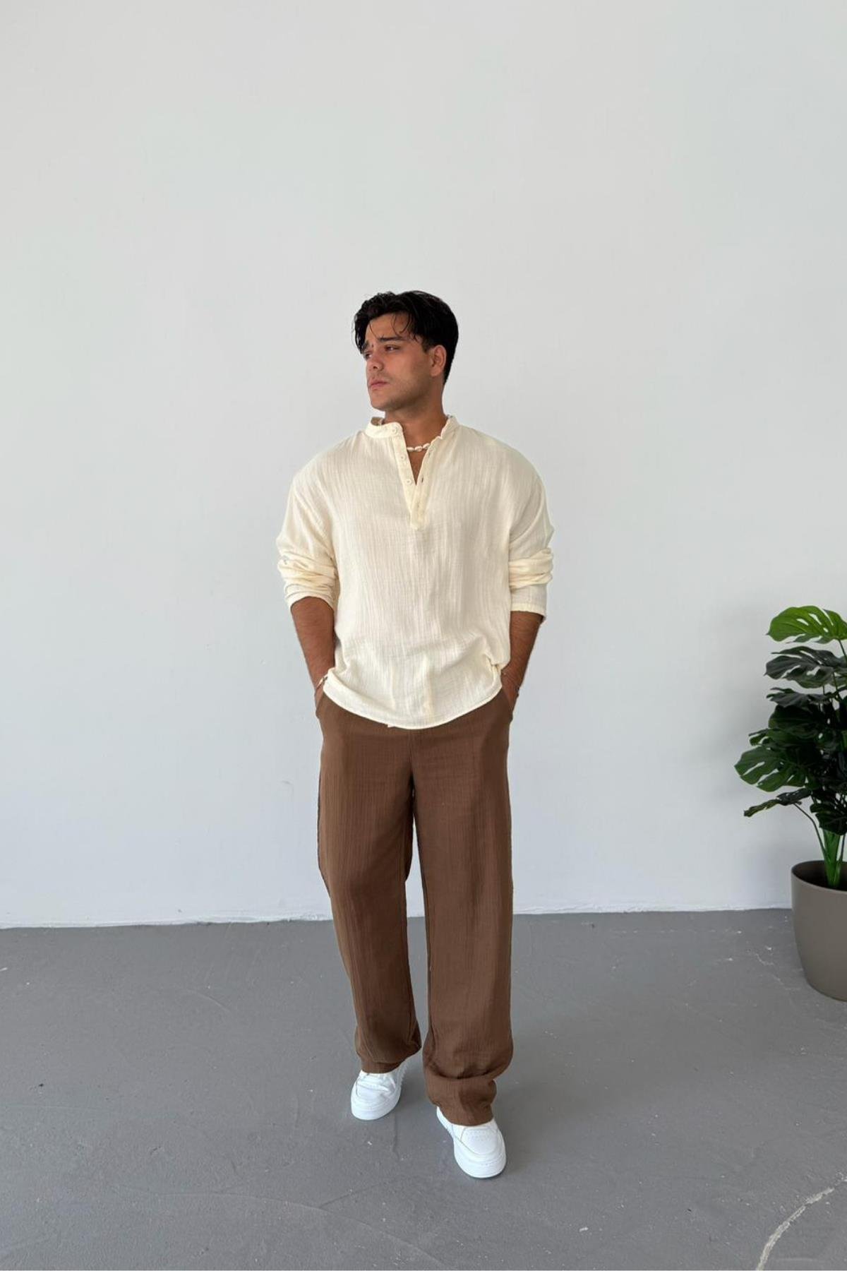 Krem Müslin Kumaş Hakim Yaka Tişört