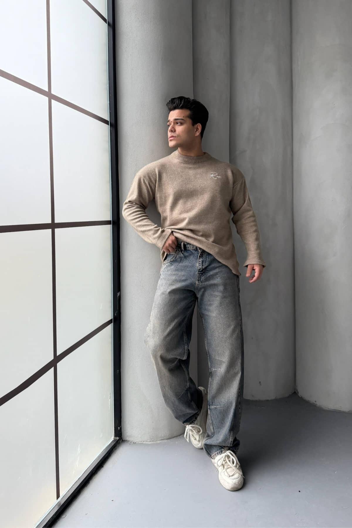 Saks Mavi Respire Nakışlı Kazak Siyah Respire Nakışlı Kazak