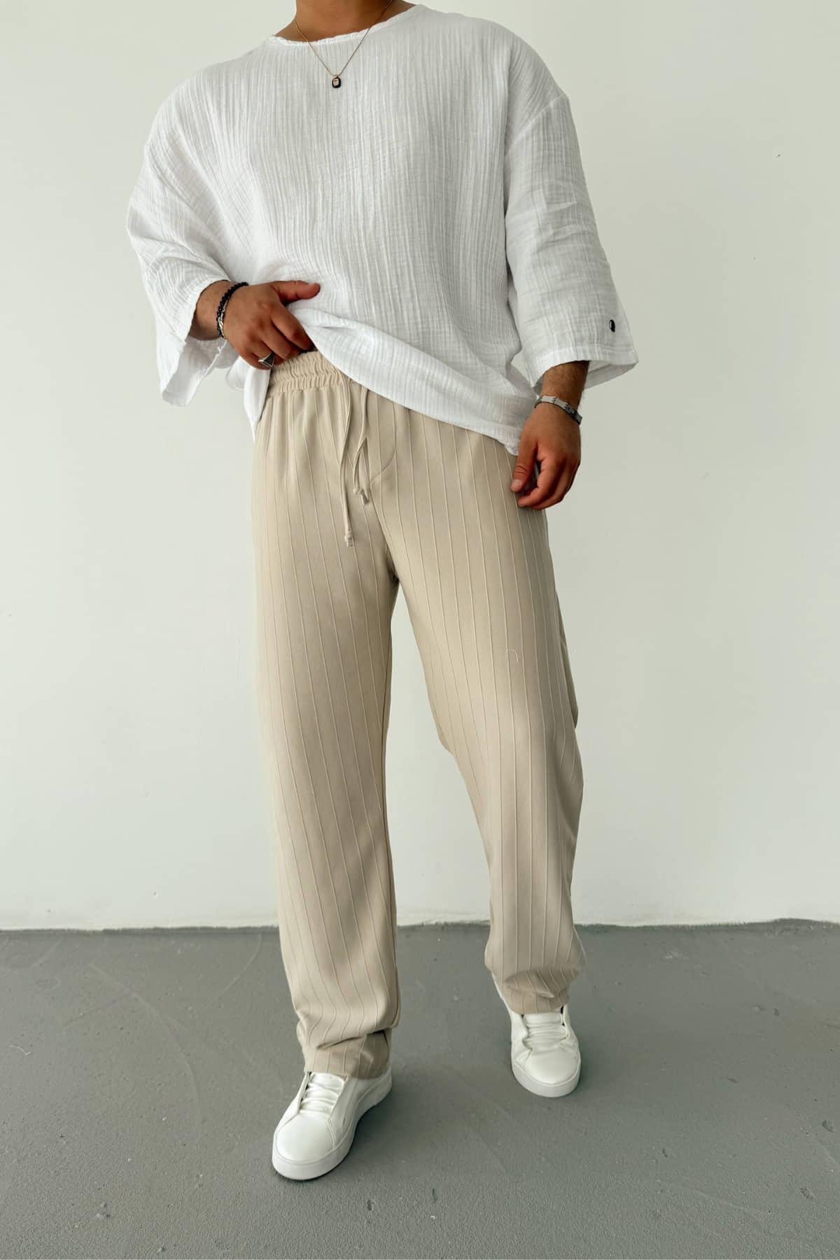 Krem Şeritli Baggy Pantolon
