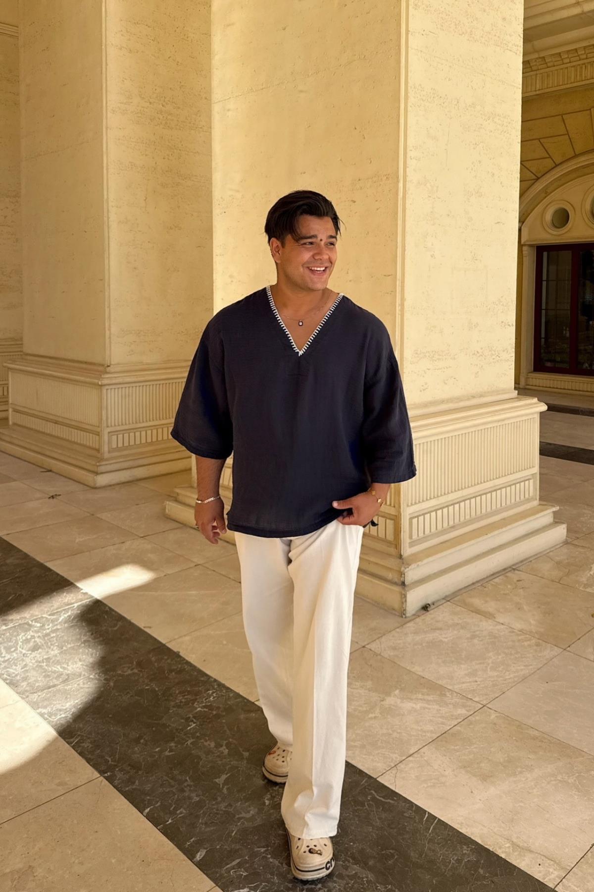 Lacivert Müslin Kumaş V Yaka Fakir Kol