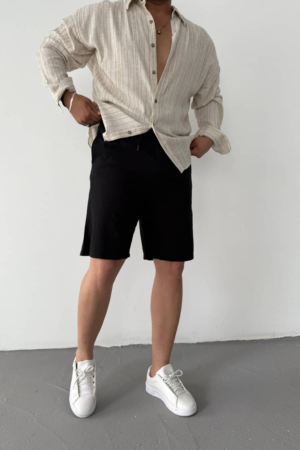 Siyah İpli Keten Şort