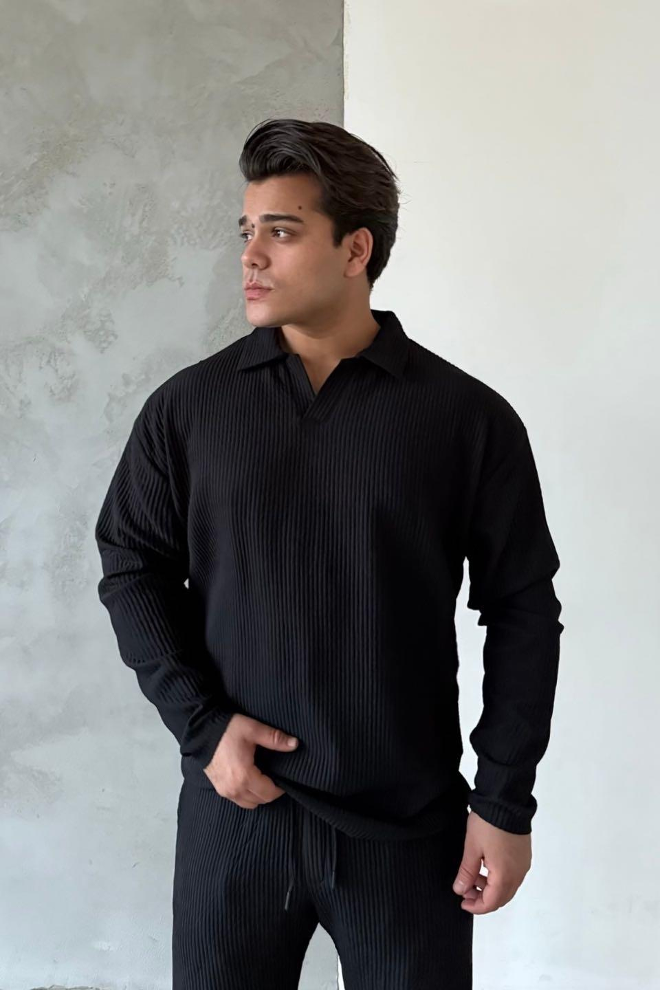 Siyah Ottoman Kumaş Fitilli Polo Yaka Triko