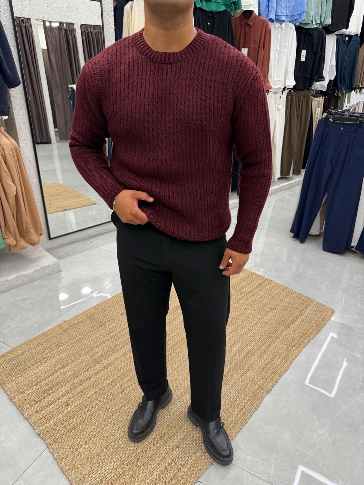 Zikzak Çizgili Kazak Regular Kalıp Bordo