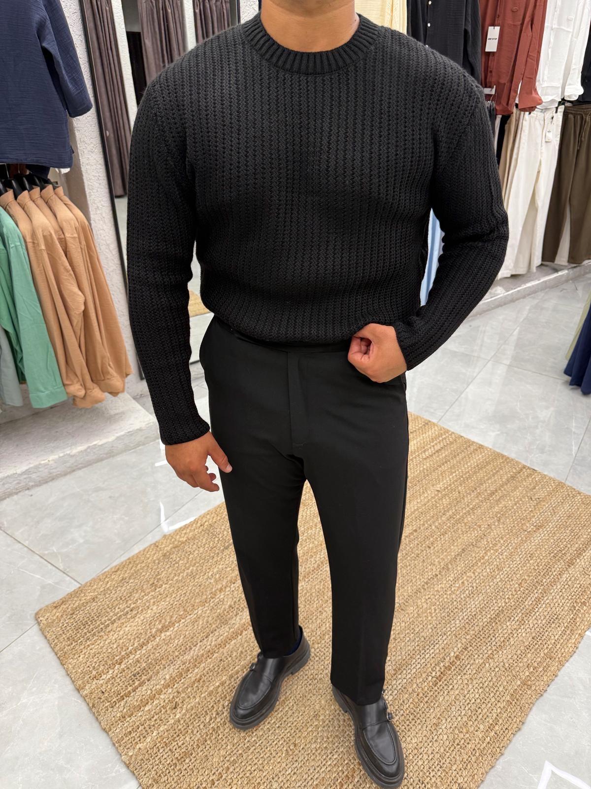 Zikzak Çizgili Kazak Regular Kalıp Siyah